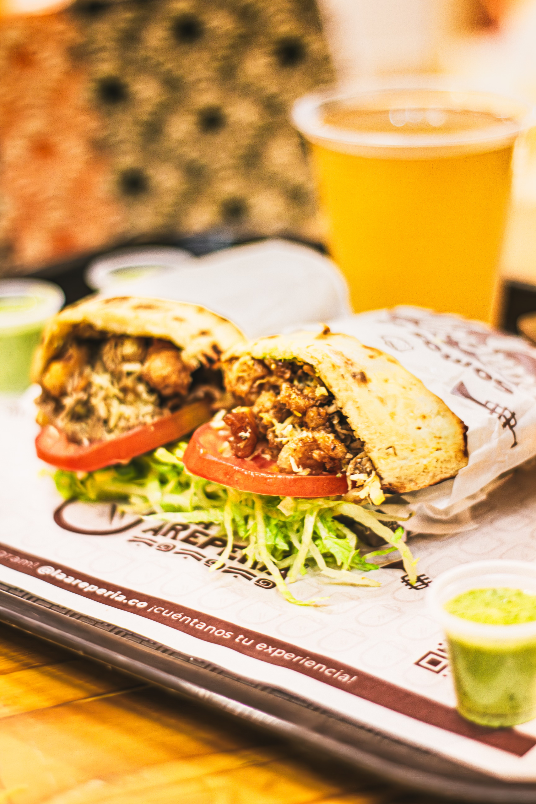 La favorita de todos. Lleva pollo, carne, chicharrón y verduras frescas, envuelta en una arepa caliente y crocante.